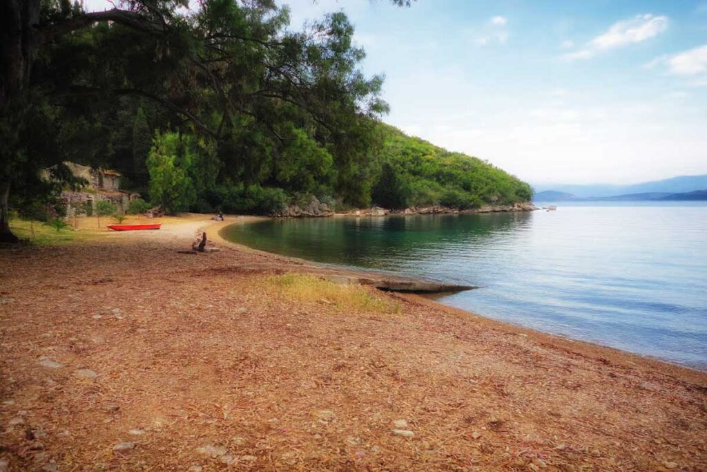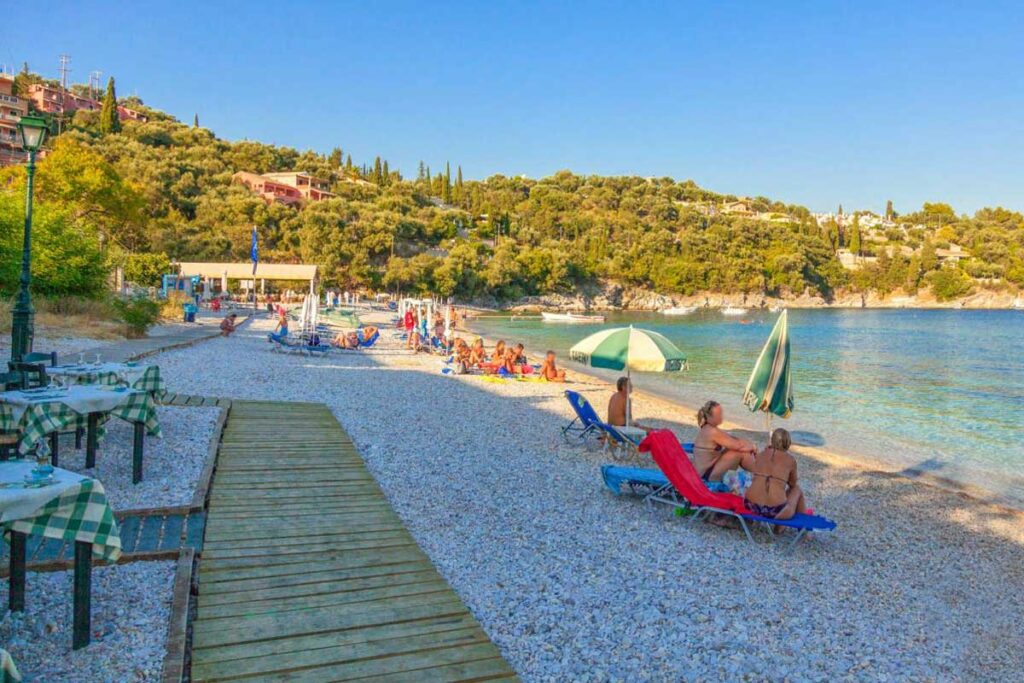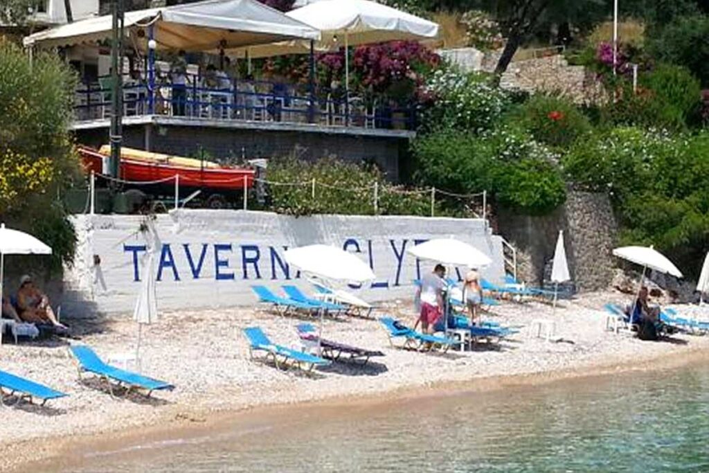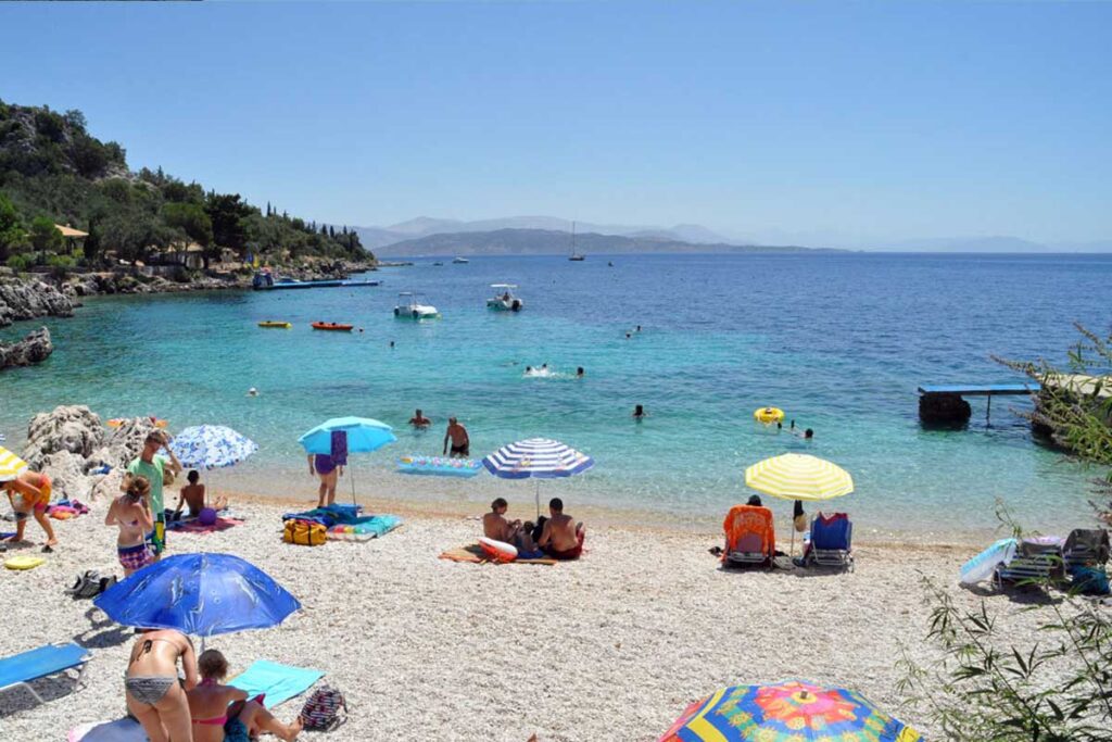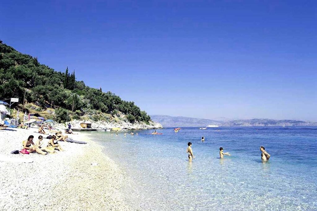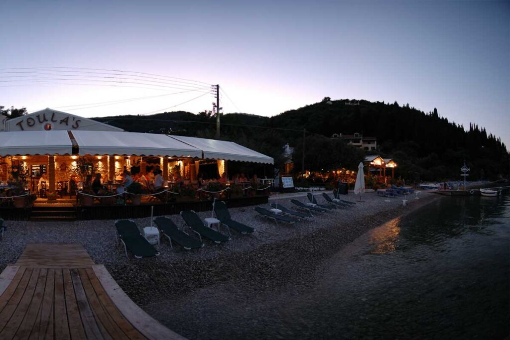 Ein ruhiger kleiner Strand zwischen Barbati und Nissaki. Ein wunderschöner Ort, um ein ruhiges Bad zu genießen und eine großartige Mahlzeit in der berühmten Glyfa Taverna mit Blick auf das Meer und Korfu-Stadt am fernen Horizont.