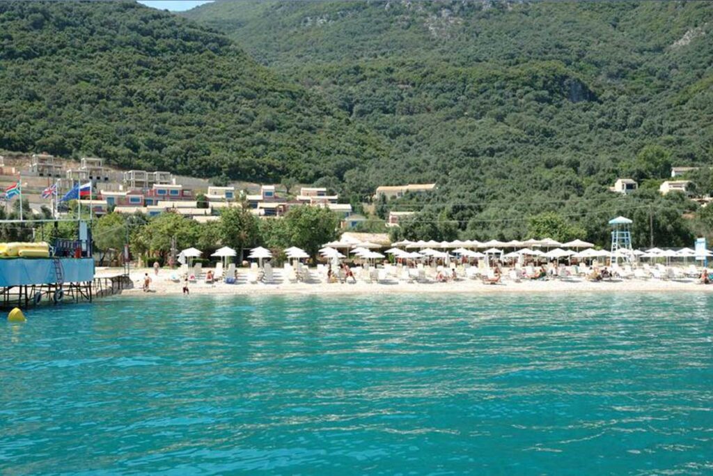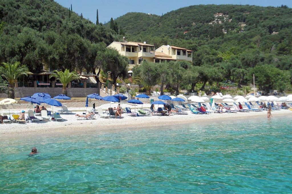 In einer spektakulären natürlichen Umgebung liegt der Strand von Nissaki, ein schöner Kieselstrand, der mit der blauen Flagge für seine Sauberkeit ausgezeichnet wurde.